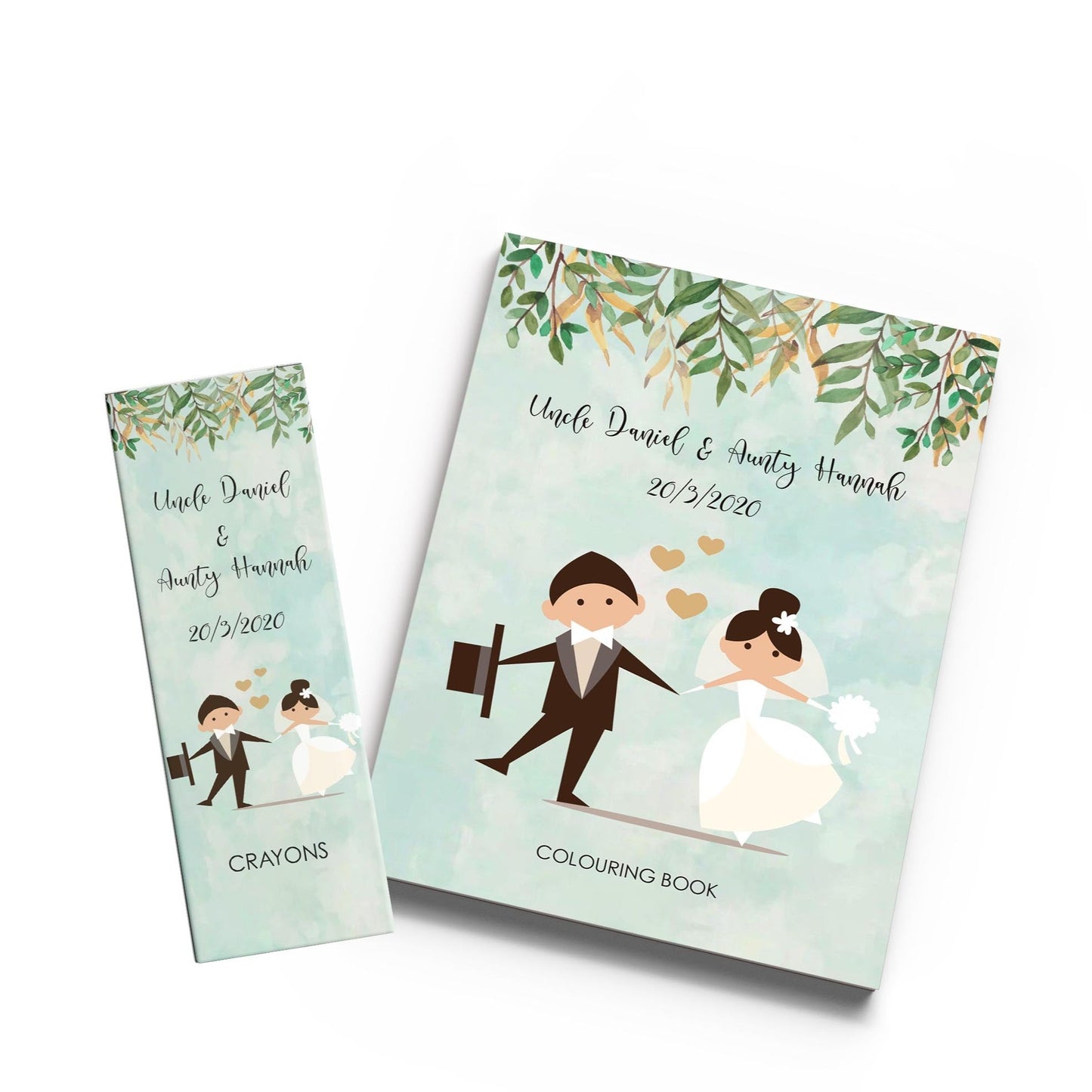 Our personalised mini colouring books are designed to suit your wedding theme.